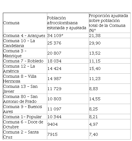 Con base en la caracterización de la población afrodescendiente que realizó la Alcaldía de Medellín en el año 2010-2011 (estudio más reciente con el que cuenta la ciudad), se determinó que aproximadamente el 70 % de la población afro de la ciudad se encuentra en las comunas de Aranjuez, La Candelaria, Manrique, Robledo, Villa Hermosa, La América, San Javier, Buenos Aires, Popular y en el corregimiento de San Antonio de Prado. Las comunas con mayor presencia de población afrodescendiente son Aranjuez, Manrique, Robledo y el corregimiento de San Antonio de Prado, y las comunas donde hay menos presencia de esta población son Poblado, Laureles y los corregimientos de Santa Elena, Altavista y San Cristóbal (Alcaldía de Medellín, 2011, p. 73).