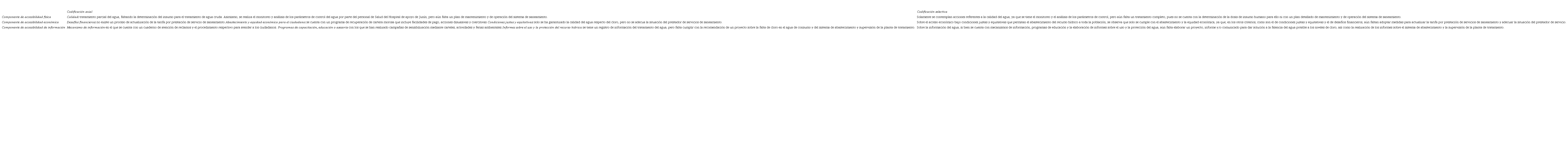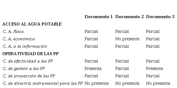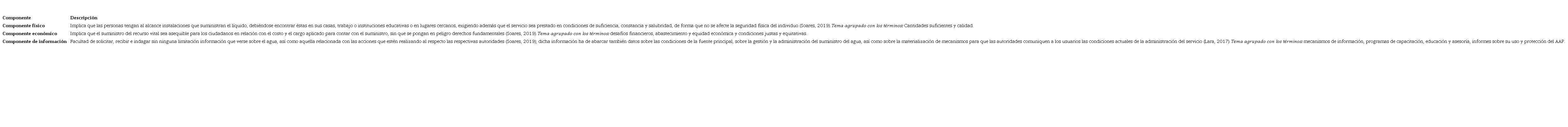 Es así como, finalmente, el acceso al derecho al agua potable (teniendo presente la conceptualización de la Observación general No. 15) va a implicar la observancia de los componentes de accesibilidad física, económica e informativa conforme se los desarrolla conceptualmente, como se ve en la Tabla 1: