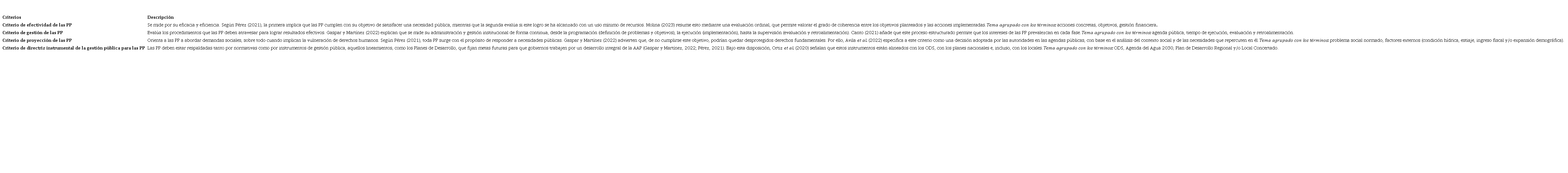 Sobre el planteamiento de la operatividad de las PP, autores como Pérez (2021) y Gaspar y Martínez (2022) establecen cuatros criterios necesarios para validar la viabilidad de los proyectos públicos, los mismos que se mostrarán en la Tabla 2.Estos criterios permiten evaluar la capacidad del gobierno local (representado por la Municipalidad Provincial de Junín) para diseñar e implementar políticas que aseguren el acceso equitativo y sostenible al agua potable en el distrito de Junín.