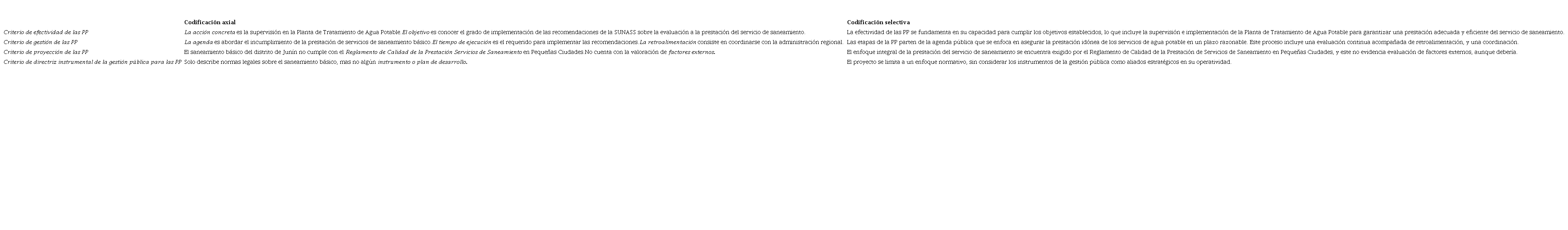 Así, del primer criterio, relativo a la efectividad de las PP (con los términos base de acciones concretas, objetivos y gestión financiera), se destaca que, en los documentos revisados, esta efectividad está sustentada en el objetivo y en la acción concreta de la supervisión e implementación de la Planta de Tratamiento de Agua Potable, orientada a asegurar una prestación adecuada y eficiente del servicio de saneamiento. No obstante, no se encontró evidencia respecto de la gestión financiera, lo que limita la evaluación de este criterio y arrojando como resultado un cumplimiento parcial. En este sentido, Pérez (2021) destaca que la ausencia de dicho tipo de gestión en la efectividad de las PP genera un déficit directo al valor público.