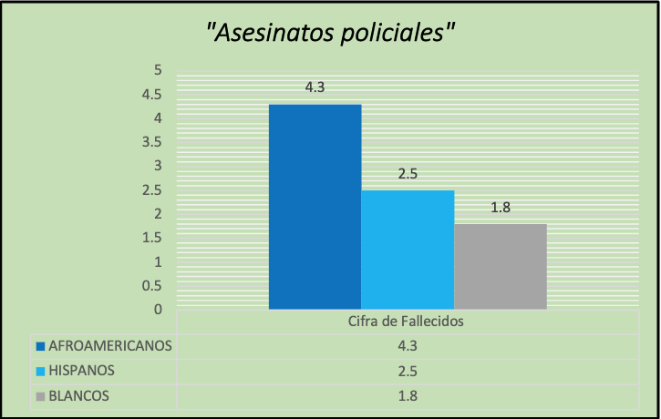 Nota: El grafico estadístico representa los Asesinatos policiales por millón de habitantes. “Los negros han sido el 28% de los asesinados por la policía a pesar de ser solo el 13% de la población”.