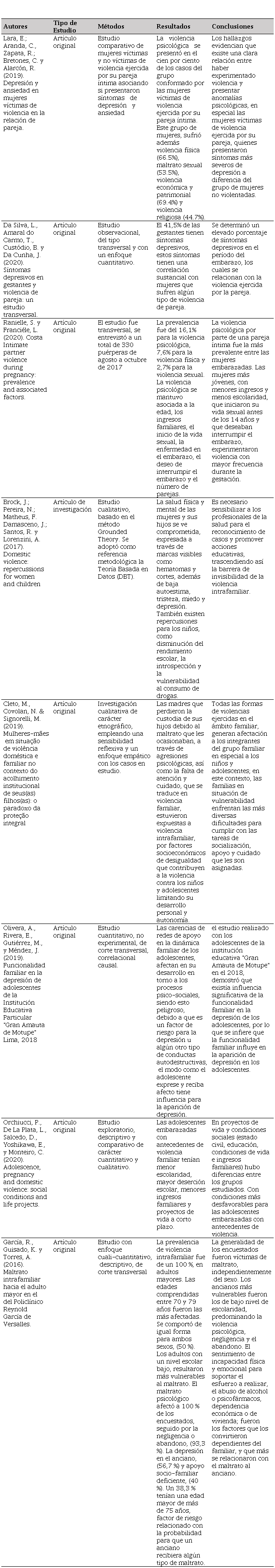El presente estudio tuvo como objetivo sistematizar evidencia científica disponible sobre violencia familiar y su relación con los trastornos depresivos. En efecto, los resultados de los artículos revisados demostraron que las mujeres expuestas a violencia, por sus parejas íntimas, sufrieron de maltratos psicológicos en el 100% de los casos (Lara et al., 2019) seguidos de maltratos físicos, violencia sexual, violencia económica patrimonial, incluida violencia religiosa; siendo que en el Cercado de Lima, en el 2019, se registraron 561 denuncias por violencia familiar de las cuales, el 36% correspondieron a mujeres entre los 18 a 29 años de edad, el 34% fueron mujeres entre los 30 a 59 años de edad, seguido por 11.05% de casos de mujeres mayores de 60 años, reportándose un porcentaje menor de casos de menores entre 1 a 17 años que equivalieron al 3.38%, siendo la violencia psicológica la de mayor prevalencia con un 72.37% seguida de la violencia física con un 7.48%, existiendo denuncias por ambas agresiones que llegaron a un 16.58% (DIVPCVF, diciembre 2019).