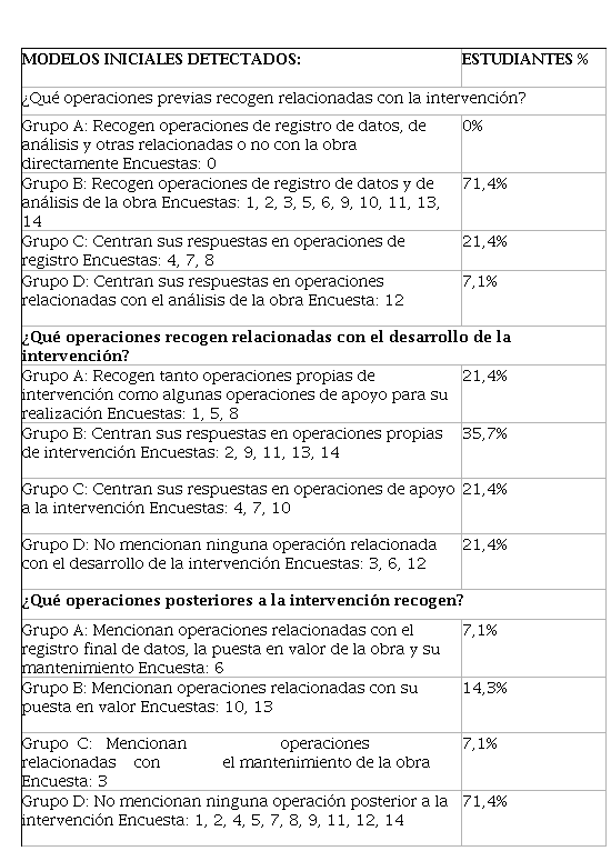 Se realizaron un total de catorce encuestas en las que los resultados se ordenaron y agruparon en tres bloques para facilitar su análisis. En primer lugar, se agruparon aquellas respuestas relacionadas con las actividades previas a la restauración, en segundo lugar, las que indicaban operaciones propias de restauración, y en último lugar, aquellas que reflejaban actuaciones posteriores a la intervención.