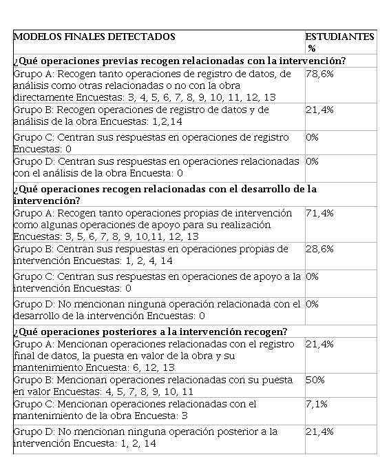 Al analizar los resultados obtenidos se pudo observar cómo en los esquemas mentales de los alumnos las operaciones que más detalladamente aparecen expuestas son aquellas relacionadas con las pautas previas a la intervención. Y aunque el porcentaje disminuye considerablemente en cuanto a las referencias relacionadas con actuaciones de intervención, las operaciones a realizar una vez finalizada la restauración son las menos presentes en sus esquemas de actuación.