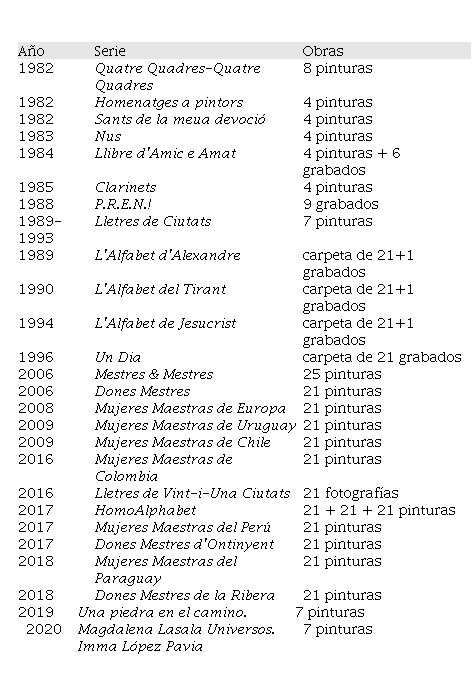 El catálogo general de las obras de Ricard Huerta reúne desde 1982 un total de 26 series artísticas que suman 326 pinturas, 62 grabados y 21 fotografías divididas en dos bloques de contenidos. El primero de ellos tiene 16 series con 112 pinturas y la totalidad de grabados y fotografías, destacando del conjunto varios alfabetos de temática histórica sobre Alejandro, Jesucristo o Tirant lo Blanc. El segundo bloque de contenidos consiste en 10 series más, realizadas desde 2006 con 214 pinturas en homenaje a las mujeres maestras del País Valenciano y de Iberoamérica con exposiciones internacionales celebradas en Bruselas, Chile, Colombia, Paraguay, Perú o Uruguay. A continuación se sintetiza en una tabla el listado de su producción artística.