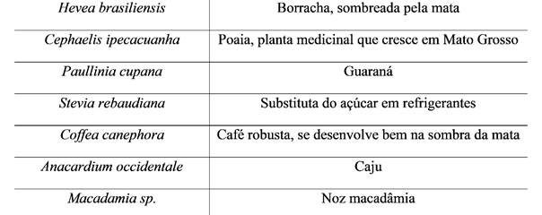 O plantio de outras espécies arbóreas buscou dar maior sustentabilidade ao empreendimento, o que, na época, foi atividade pioneira e raramente aplicada na região. Os técnicos incentivaram a plantação de espécies como o jatobá (Hymenaea sp.), a copaíba oleosa (Copaifera langsdorffii), rica em substâncias medicinais anti-inflamatórias, o cumaru (Dipteryx odorata), uma madeira dura, com diversas qualidades medicinais, utilizada também na obtenção de fragrâncias para perfumes.