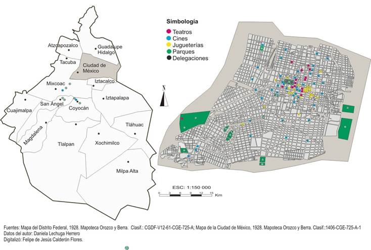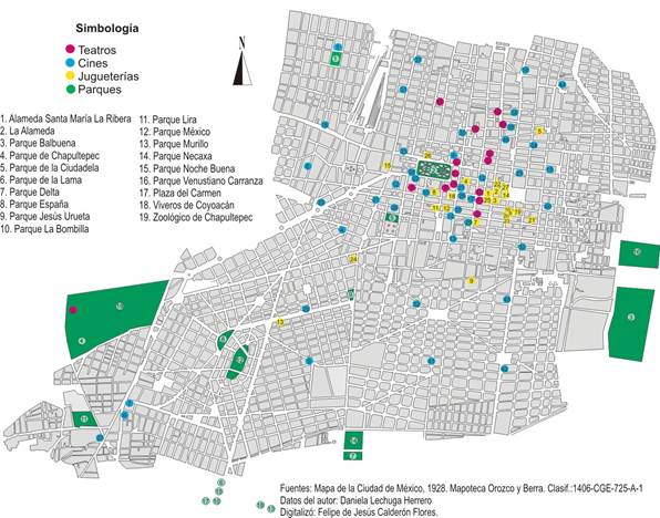 En el Plano 1, se presenta la Ciudad de México en 1928. Como se puede observar, muchos de los sitios que resultaban atractivos para los niños, como parques, jugueterías, cines y teatros, tendieron a permanecer en la zona central de la urbe. En las calles que rodearon la Alameda y la Plaza de la Constitución hacia el oriente, los comercios, los cines y los teatros se ubican uno tras otro, lo que hace pensar en que esta parte de la capital se “especializó”, entre otros asuntos, en el comercio y diversión para los niños. Estas calles — y el transitar de un comercio a otro — dieron visibilidad a la infancia entre 1928 y 1940.