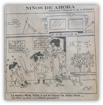Todo apunta a que los niños se reconocieran a sí mismos como compradores potenciales, exigiendo a sus padres regalos a lo largo del año, sobre todo en el marco de las festividades.[24] Este nuevo comportamiento infantil quedó plasmado en una caricatura del periódico El Universal, en la que se observa a dos niños que respondían a su madre, después de haber recibido su regalo de los Santos Reyes, que se trataba de “valiente porquería”.[25] Además, la escena llama la atención porque ambos niños — junto con un perro — se encontraban en la calle, afuera de lo que probablemente era un edificio de departamentos. Igualmente, es interesante porque los niños, aparentemente, estaban realizando travesuras e, incluso, golpeándose.