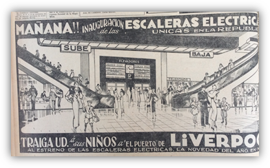 Por otro lado, esos espacios de consumo se convirtieron en un lugar de recreación infantil. Tal es el caso del Puerto de Liverpool, a donde se invitaba a los padres a que acudieran con los niños a la inauguración de las primeras escaleras eléctricas del país. En el anuncio se puede observar a familias elegantemente vestidas. Los niños, tomados de la mano de sus padres, ocupaban el lugar central de la imagen. Indudablemente, era el tipo de lugar al que los niños de sectores medios acudían, según lo indicaba la prensa.