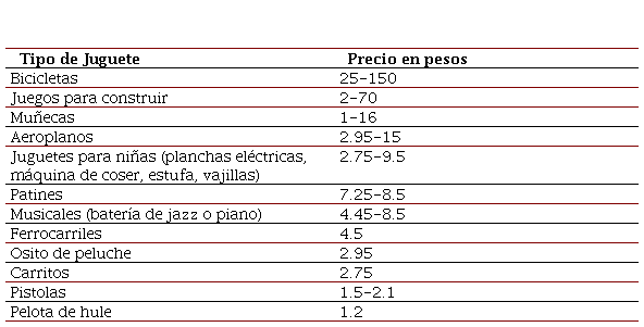 En este aspecto, es interesante notar que los juguetes que probablemente fueron más adquiridos, debido a su precio, son las pelotas de hule, las pistolas, los carritos y los ositos de peluche. A diferencia de las bicicletas, los juegos para construir, las muñecas o los aeroplanos que seguramente sólo pudieron ser adquiridos por pocos niños. Sin embargo, sí es notable que los precios abarcaron un rango amplio de posibilidades de compra.