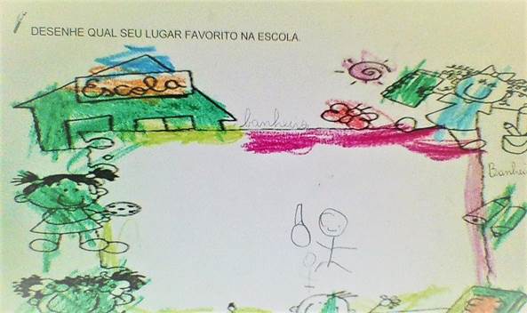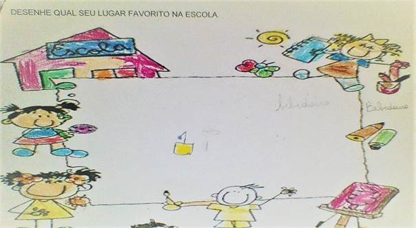 As crianças da pesquisa manifestaram seus desejos na busca pela liberdade, a partir da criação de momentos e espaços de resistência para a socialização, onde interagiam com outras crianças, por meio de conversas e por brincadeiras. Essas rotas de fuga eram criadas nos momentos de ir ao banheiro e ao bebedouro, que acabaram se tornando seus lugares preferidos na escola. Por outro lado, observamos também a aceitação de algumas pelo espaço imposto que era a sala de aula e até mesmo os cartazes que a decoravam. Outras, ainda, elegeram a cozinha, o salão e o parquinho como espaços favoritos. Os desenhos foram classificados da seguinte forma: banheiro três (3) crianças; bebedouro três (3); cartazes da sala duas (2); cozinha da escola uma (1); sala de aula uma (1); parquinho uma (1); salão uma (1).