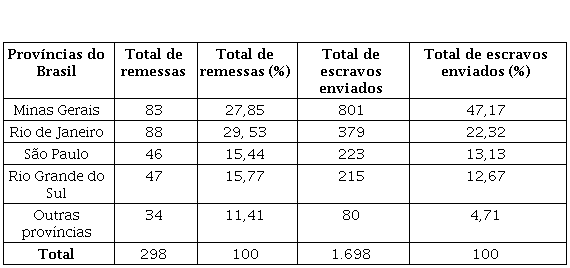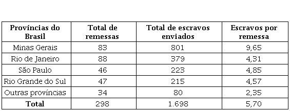 No total, os estrangeiros enviaram um total de 1.698 escravos do Rio de Janeiro para outras províncias do Brasil em um total de 298 remessas. O interessante é a discrepância entre os dados para Minas Gerais e para as outras regiões. O Rio de Janeiro foi a província que mais recebeu remessas de escravos, com 88 (29,53% do total), com Minas Gerais logo atrás com 83 remessas (27,85%). Mas a diferença se dá no total de escravos enviados. Se as remessas para o Rio de Janeiro se compunham de 379 escravos (22,32%), o total de escravos remetidos para Minas Gerais foi de 801 (47,17%). É uma diferença muito grande, como pode ser observado na tabela 2 seguinte: