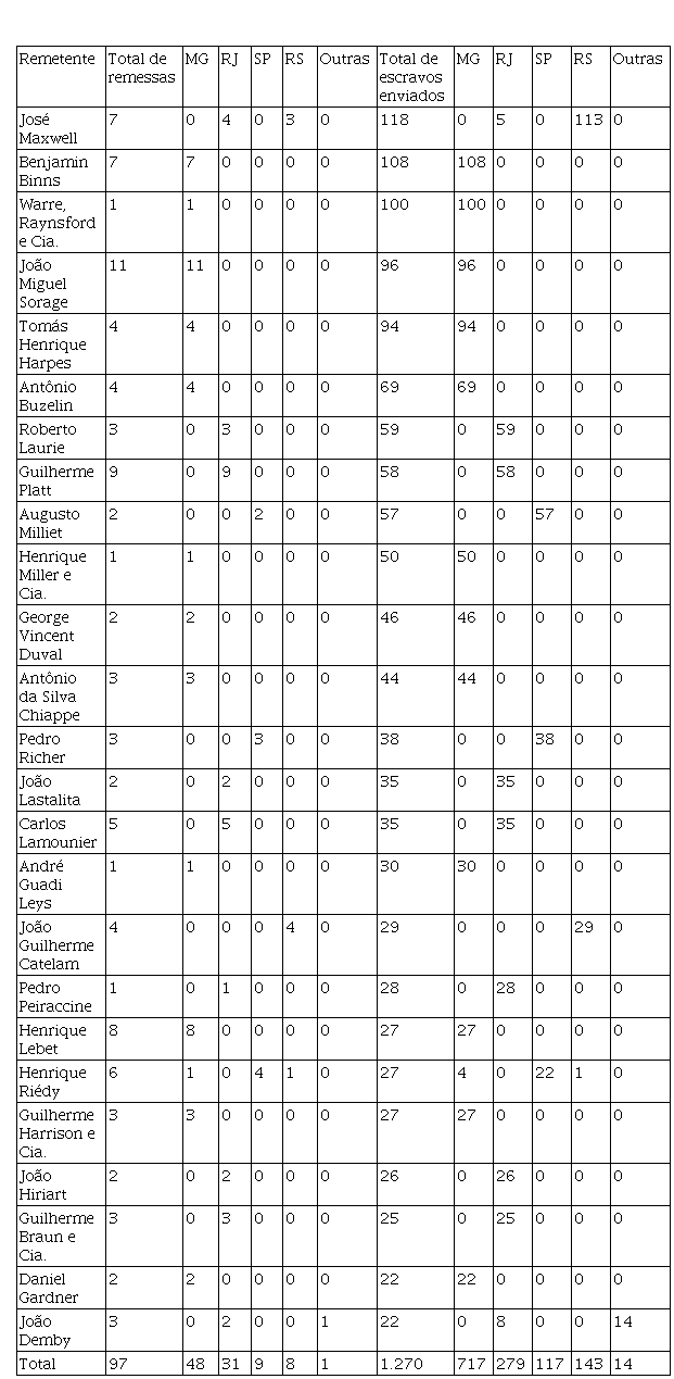 Do total de 185 indivíduos ou empresas estrangeiras que remeteram escravos do Rio de Janeiro para outras províncias do Sudeste e Sul do Império, 25 estão dentro dos parâmetros estabelecidos acima para “principais remetentes”. Eles perfazem apenas 13,51% do total de remetentes. Além disso, suas remessas totais somam 97 viagens, 32,55% das 298 registradas. No entanto, o número de escravos remetidos por eles foi de 1.270, um percentual de 74,80 dos 1.698 escravos enviados. Como esperado, a região que mais recebeu escravos foi Minas Gerais, com 717 (56,46%), seguida do Rio de Janeiro, com 279 (21,97%); o Rio Grande do Sul, com 143 (11,26%); e São Paulo, com 117 (9,21%). O volume da província gaúcha foi inflacionado pelo remetente José Maxwell, ligado à firma Maxwell, Wright & Co. (SANTOS, 2014), que em três viagens remeteu 113 escravos para a província sulista.
