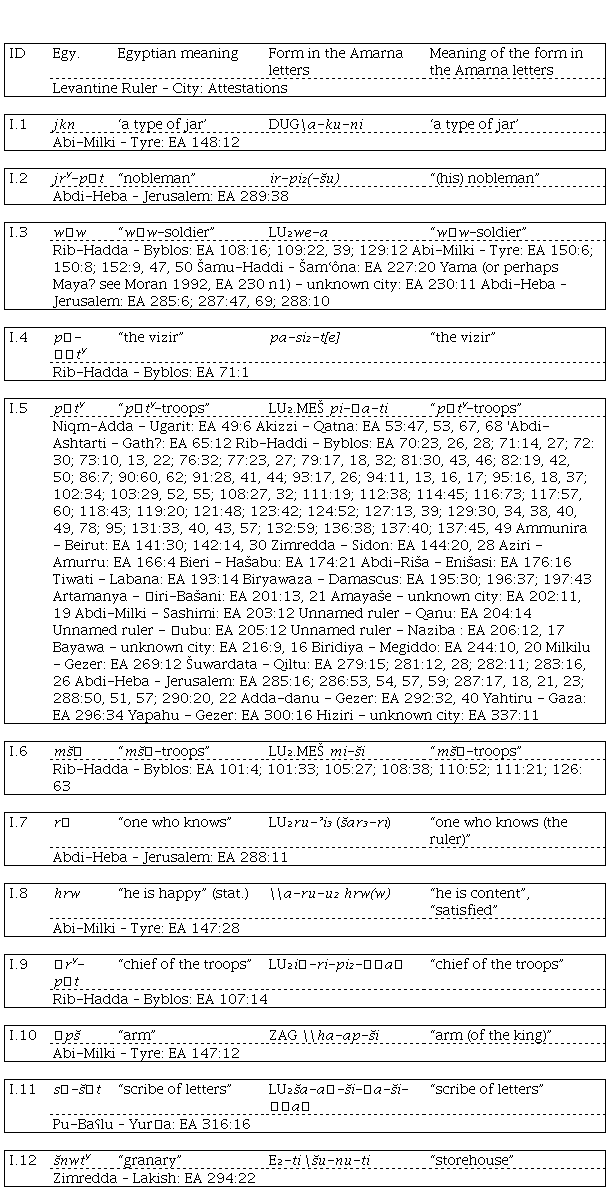 Moreover, we have to remember that the Amarna letters were written in Akkadian, a language that did have a rich lexicon covering trade and administrative practices. At the same time, as mentioned, the Egyptian words attested in the Amarna corpus refer primarily to Egyptian-specific realities (such as Egyptian military and administrative titles). Therefore it is also possible that the Egyptian loanwords attested in Hebrew existed already in the Canaanite of the Amarna age, but they do not appear in the Amarna letters simply because the scribes writing them were using Akkadian equivalents whenever possible, and were resorting to Egyptian terms only for uniquely Egyptian terms and/or words that they perceived as somehow “untranslatable”.