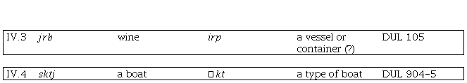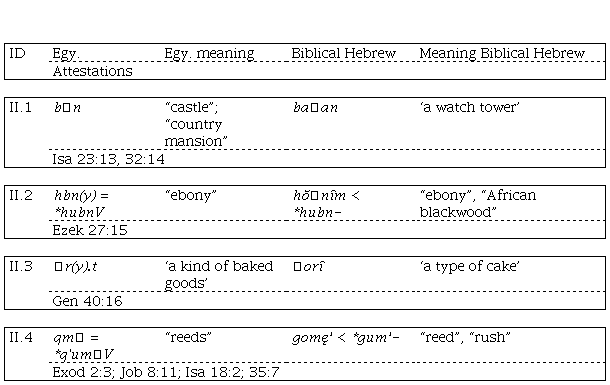 • 4 have been likely borrowed during the New Kingdom or Third Intermediate Period, either because of their vocalization or because comparable Egyptian forms are attested only in this period. They are: