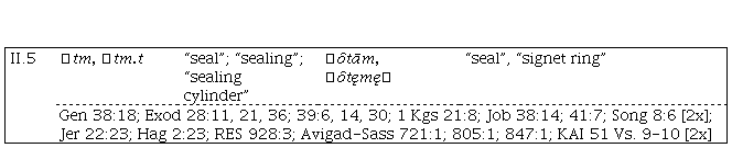• 3 words related with the scribal and administrative domain (ḥôtām, ḥôtęmęṯ = “seal”, “signet ring”; dᵉyô = “ink”; qęsęt = “scribal palette”)
