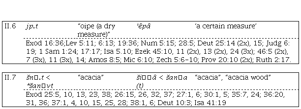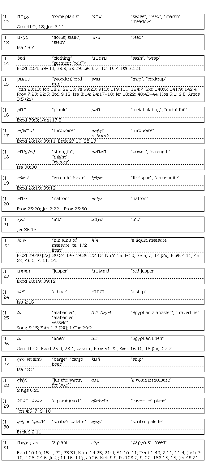 • 10 of them can be excluded either because of problems in the phonological or semantic correspondences (i.e. bad = “pole”; bad = “linen”; boḥan = “greywacke”; gāḇîaˤ = “cup”, “cup-shaped candleholder”; mešî = ‘a garment’; pᵉʾer = “headwrap”, “turban”; piṭḏâ = ‘a gemstone’, perhaps “peridot”; qop̄, qôp̄ = ‘an African monkey’; taḥaš = “stretched leather”; tukî = ‘a female African ape’)