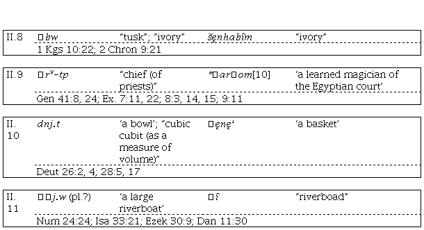 • 5 of them can also be excluded because they were likely borrowed after the New Kingdom and Third Intermediate Period (i.e. ʾaḥ = “brazier”; ʾeṭûn = “fine linen”; baḥaṭ = ‘a costly stone’; šô/ûšan = “water lily”, “Egyptian lotus”; teḇâ = “ark”, “basket”)