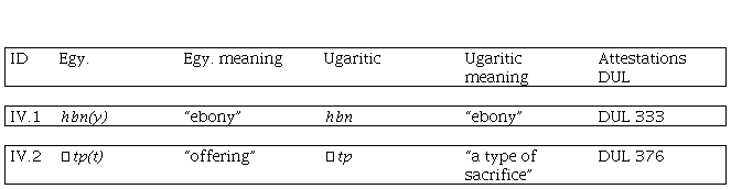 As mentioned above, Ugaritic lied outside the Egyptian sphere of influence during most if not all of the New Kingdom. However, Ugarit is also the only costal city in the region that was in contact with Egypt and which yielded significant textual archives. A look at the Egyptian loanwords attested there, therefore, can be useful to put the fragmentary evidence from Lebanon and the Southern Levant into perspective. First of all, however, a methodological note: Ugaritic sources date to the New Kingdom, so in contrast with Hebrew and Phoenician, we can be sure that any Egyptian word attested there was not borrowed after the New Kingdom. However, like Phoenician, Ugaritic was mostly written only consonantally, and without precise information about the vowel it is often impossible to say if a word was borrowed during the New Kingdom or before it. This said, there are 5 words of possible Egyptian origin in Ugaritic[14]. They are the following: