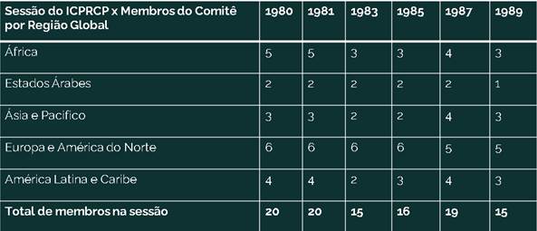 Com base no quadro, é possível afirmar que, nas sessões do Comitê, houve uma predominância dos países da Europa e América do Norte[9] ao longo da década de 1980, embora os números variem entre cada sessão. Da mesma forma, é perceptível uma considerável participação proporcional de representantes da América Latina e Caribe[10] e da África[11]. Em conjunto, os últimos ocuparam menos da metade das cadeiras do Comitê. Ademais, ainda observa-se uma oscilação negativa da participação dos Estados Árabes[12], assim como uma oscilação positiva dos países situados na Ásia e no Pacífico[13].