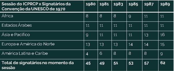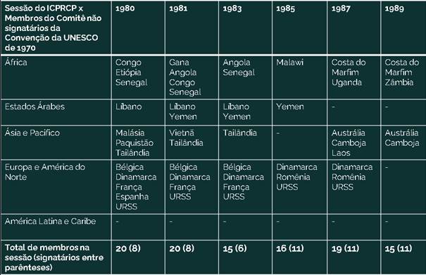 É notável que, no decurso dos anos 1980, o número de participantes do Comitê que eram signatários da Convenção cresceu significativamente, tendo na última sessão (1989) quase atingido o índice de três quartos (11 em 15). A partir disso, podemos afirmar que o número de países que participavam do Comitê sem ter ratificado a Convenção diminuiu consideravelmente. Ou seja, cada vez mais, nos anos 1980, o Comitê foi sendo ocupado por signatários da Convenção da UNESCO de 1970. Contudo, isso não significou um aprofundamento das discussões sobre restituições e/ou retorno de bens culturais de interesse patrimonial removidos das regiões economicamente mais pobres do planeta, tais como a África ou a América Latina.