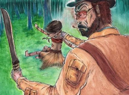 A aluna escreveu com certa familiaridade a história, pois se sentiu atraída, pois reconhece importância na ação, e na divulgação das estruturas temporais que conformavam à narrativa. Reproduziu uma memória, fruto de sua entrevista, com viés ligado ao que já havia sido descoberto no processo de ensino-aprendizagem, sobre a atuação bugreira na comunidade e sobre a presença de culturas indígenas em meio aos relatos sobre o passado de Tigipió. Produziu conhecimento devido a uma ligação significante com o que percebeu durante o ensino de História, baseando-se em descobertas e nas construções históricas do projeto escolar. Concordando com a proposta de uma Nova História Indígena, o texto de Liriane nos oportuniza recuperar sujeitos históricos que agiam de acordo com o que acontecia ao seu redor. Há percepções e interpretações que podem ser feitas sobre história indígena na escrita da aluna. O texto exalta memórias sobre bugreiros, mas igualmente nos mostra o que viveram e as estratégias tomadas pelas meninas capturadas, antes de serem entregues para adoção pelos colonos. É preciso de sensibilidade antropológica para a interpretação das imagens que vem à tona durante a leitura de O som do desespero e de sua ilustração, construída por um ex-aluno e colaborador do projeto escolar, o estudante Igor Eduardo Machado[15].