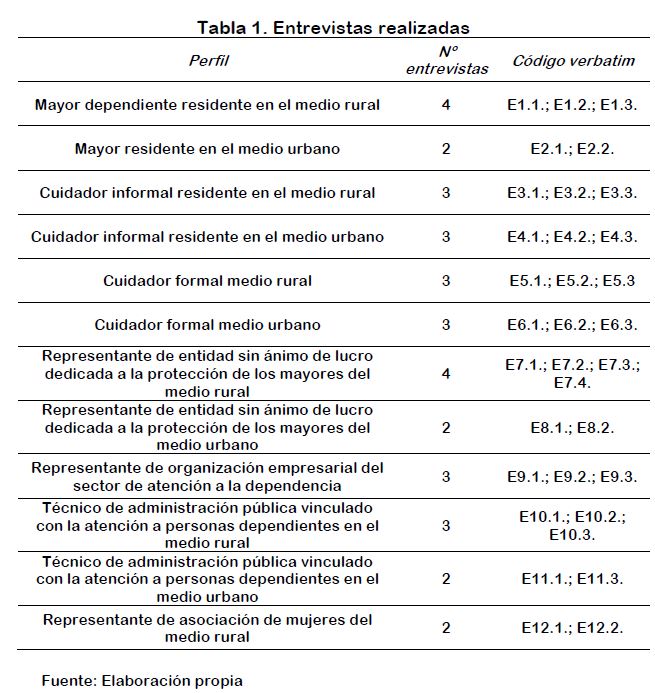 Hemos efectuado entrevistas semi-estructuradas, tal y como establecen Taylor y Bogdan (1994) o Alonso (1995 y 1998) para comprender como se realiza la provisión de cuidados, formales e informales, a los mayores dependientes, prestando una especial atención a aquellos que residen en los entornos rurales. A través de este esta técnica, indagamos sobre las percepciones y valoraciones de los entrevistados en tanto que miembros de diferentes realidades grupales (Montañés, 2009). El propósito es obtener informaciones que nos ayuden a discernir como los sujetos se mueven entre las prácticas y los discursos y comprobar las estrategias simbólicas que legitiman o deslegitiman a los sujetos y sus prácticas (Martín, 2014).