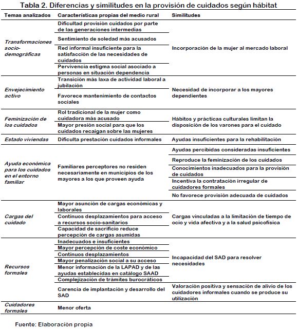 Por tanto, la discusión de los resultados nos ha permitido explicitar las características propias del medio rural y las similitudes con el entorno urbano en relación a la provisión de cuidados formales e informales. Sirva la tabla 2 como resumen de los principales temas analizados para esclarecer las evidencias encontradas.