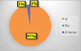 De 117 docentes, el 97% indica que, si existe inclusión de los educandos con discapacidad, mientras un 2% indica que a veces y 1% indica que no existe.