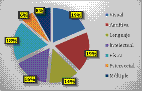 Después de encuestar a 117 docentes, se puede determinar que los tipos de discapacidad que más se conocen son física y auditiva, y las menos conocidas son la múltiple y psicosocial.