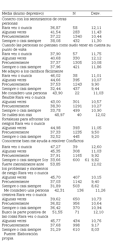 Lo citado se hace aún más relevante en los ítems me adapto a los cambios fácilmente (capacidades empáticas), sé cuáles son mis fortalezas para afrontar los riesgos, conocerme bien me ayuda a resolver conflictos, soy fuerte mentalmente ante los problemas y momentos de riesgo y busco la parte positiva de las cosas (fortaleza personal), donde las diferencias en función del nivel de respuesta muestran discrepancias ostensiblemente significativas, observándose niveles medios de ánimo depresivo muy superiores en las personas que contestan rara vez o nunca o algunas veces, respecto a aquellas que perciben que frecuentemente o siempre o casi siempre desarrollan las competencias adyacentes a los ítems señalados.