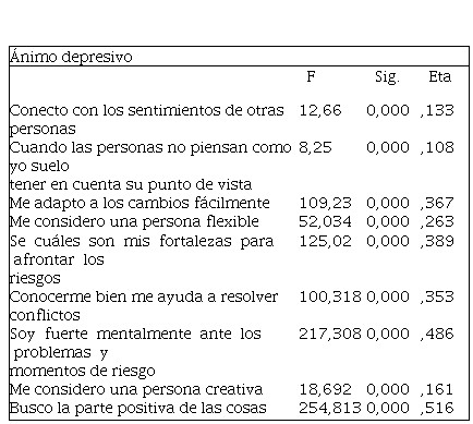 Como podemos observar, los resultados del sig. nos indican la existencia de relación entre todas los ítems analizados y el ánimo depresivo en población española. Pese a lo citado, los valores de F y Eta muestran como los ítems a) me adapto a los cambios fácilmente (capacidades empáticas), b) se cuáles son mis fortalezas para afrontar los riesgos, c) conocerme bien me ayuda a resolver conflictos, d) soy fuerte mentalmente ante los problemas y momentos de riesgo y e) busco la parte positiva de las cosas (fortaleza personal) obtienen resultados muy robustos en ambos estadísticos y, por ende, una fuerte y manifiesta relación con el ánimo depresivo en población española durante el periodo analizado.