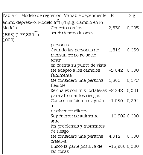 El análisis de los estadísticos B y la sig. nos indican que los ítems conecto con los sentimientos de otras personas, me adapto a los cambios fácilmente (capacidades empáticas), se cuáles son mis fortalezas para afrontar los riesgos, soy fuerte mentalmente ante los problemas y momentos de riesgo, me considero una persona creativa y busco la parte positiva de las cosas (fortaleza personal) obtienen significancia y, por lo tanto, capacidad predictora respecto al ánimo depresivo general. En concreto, los ítems soy fuerte mentalmente ante los problemas y momentos de riesgo y busco la parte positivas de las cosas muestran niveles en el estadístico B altamente representativos respecto a la variable dependiente.