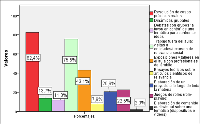 Con un 75,5% también destaca el trabajo fuera del aula a través de visitas a entidades o recursos sociales de suficiente relevancia, a lo que se une el 43,1% de las respuestas que se decantan por las exposiciones y la realización de talleres dentro del aula, pero impartidos por profesionales de diferentes ámbitos de actuación. De esta manera, se prioriza lo que relaciona la teoría con la práctica profesional, es decir, conocer cómo se desarrolla lo que han ido aprendiendo a lo largo de las asignaturas de la mano de profesionales en activo, lo que facilita que todos esos aprendizajes se puedan aterrizar y ver con la perspectiva suficiente como para afirmar que, efectivamente, sí pueden ser útiles para su futuro en la profesión.