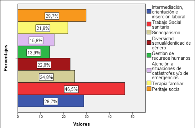 De esta manera, el Trabajo Social Sanitario se posiciona como el ámbito de actuación más deseado con casi la mitad de la muestra, un 46,5%, tal y como se observa en la Figura 2, seguido del Peritaje Social y la Intermediación, orientación e inserción laboral, con un 29,7% y 28,7% respectivamente. El Sinhogarismo (24,8%), la Diversidad sexual e identidad de Género (22,8%) y la Terapia Familiar (21,8%) continúan de cerca la lista.