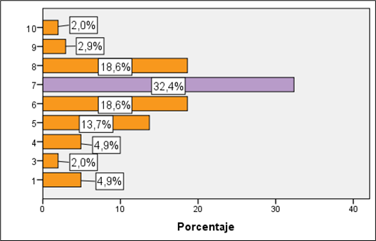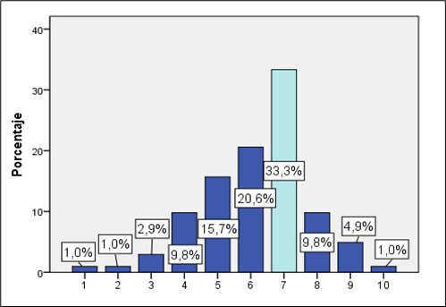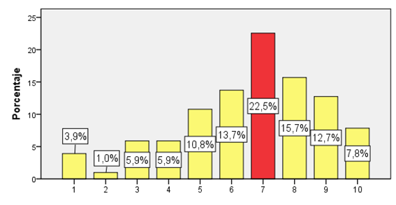 Con las prácticas curriculares, recogidas en la Figura 5, sucede lo contrario con respecto a las anteriores valoraciones, y es que la mayoría de las respuestas se concentran en la parte derecha de la gráfica, es decir, en las puntuaciones más altas. Así, el valor más repetido es el 7, y, como consecuencia de esta concentración, la media se ubica en los 6,6 puntos de satisfacción, la más alta de las cuatro.