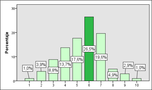 Por otra parte, en cuanto a las clases prácticas, en la Figura 4 se detalla cómo el 26,5% las valora con 6 puntos, aunque la media se anota por debajo de esta cifra, en los 5,5. Es la media más baja de los 4 valores estudiados, y la única inferior a los 6 puntos de satisfacción.