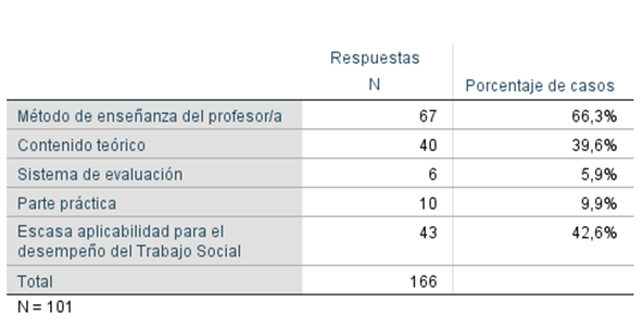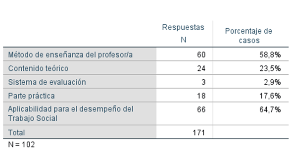 En positivo, Planificación en Trabajo Social destaca notoriamente sobre el resto como una de las materias mejor planificadas con un 14,7% de las respuestas, seguida de Trabajo Social y Políticas Sociales con un 10,8%, y Organización de los Servicios Sociales y Habilidades para las Relaciones Interpersonales, ambas con un 7,8%. Además, a la pregunta sobre aquellas asignaturas más útiles para el desarrollo del Trabajo Social, muchas coinciden con las anteriores, destacando de nuevo Planificación en Trabajo Social (14,7%), Organización de los Servicios Sociales (13,7%) y Habilidades para las Relaciones Interpersonales (11,8%), e incorporándose nuevas como Investigación, Diagnóstico y Evaluación en Trabajo Social o Trabajo Social con Grupos y Organizaciones, ambas representando un 5,9% de las respuestas. Pero, ¿Cuáles son los motivos por los que estas y no otras han sido elegidas como las más útiles y mejor planteadas? En la Tabla 1 se puede observar que, con una pregunta de respuesta múltiple –dos opciones como máximo–, ha determinado un 64,7% que la aplicabilidad para el desempeño del Trabajo Social ha sido determinante para seleccionar estas materias, seguido de cerca con un 58,8% por el método de enseñanza del profesor/a.