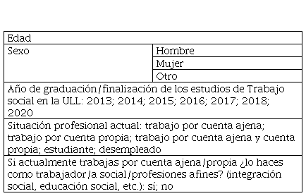 En lo relativo a la muestra, el criterio utilizado para la selección de participantes en el estudio ha sido haber obtenido el título de Grado en Trabajo Social por la Universidad de La Laguna entre los años 2013 y 2020, excluyendo así a todas aquellas personas pertenecientes a planes de estudio extintos como las diplomaturas, anteriores a este periodo. El trabajo de campo se llevó a cabo entre el 31 de enero y el 17 de febrero del 2021, y se ha utilizado un muestreo intencional por decisión razonada como consecuencia de las dificultades prácticas derivadas de la pandemia por COVID-19, la dispersión geográfica y la compleja representatividad estadística de la muestra. Además, se ha utilizado la técnica de bola de nieve para dar una mayor difusión del estudio entre los potenciales participantes, siendo los medios digitales, y más concretamente las redes sociales, la mejor herramienta para su exposición pública: WhatsApp, Gmail y LinkedIn.