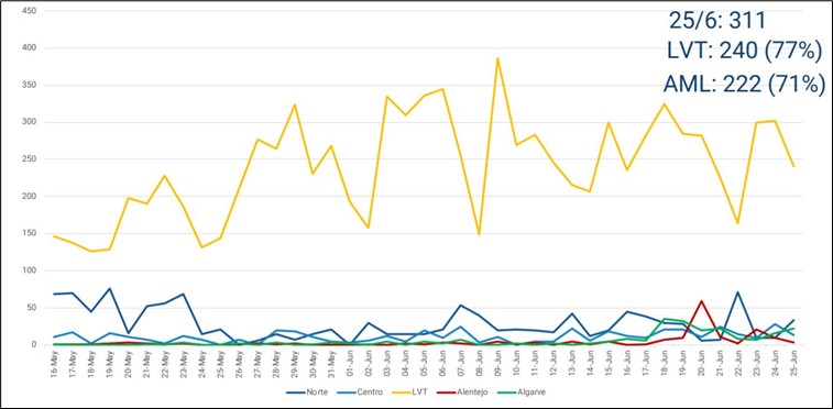 Durante o período de desconfinamento, a tendência decrescente do número de novos casos de doença na maioria das regiões do território nacional não foi verificada na região de Lisboa e Vale do Tejo (LVT), registando esta um aumento significativo do número de casos positivos de COVID-19 (Figura 1). Por forma a ver controlado os contágios nesta região foi criado, a 16 de junho, um Gabinete Regional de Intervenção para a Supressão da COVID-19 em Lisboa e Vale do Tejo (cf. Despacho n.º 6451/2020) com a finalidade de coordenar, monitorizar e acompanhar os surtos ativos de infeção por SARS-CoV-2 na Área Metropolitana de Lisboa (AML), prioritariamente nos concelhos mais afetados. Além disso, foi adiado o levantamento das restrições previstas e reforçadas as medidas de vigilância epidemiológica em atividades que concentravam um número elevado de focos de infeção, como a construção civil e um conjunto de atividades exercidas através de empresas de trabalho temporário.