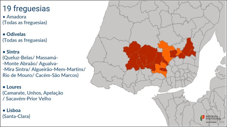Durante o mês de julho, registou-se uma incidência persistente de novos casos de contágio em 19 freguesias da AML, pertencentes aos concelhos da Amadora, Lisboa, Loures, Odivelas e Sintra (Figura 2), tendo, então, sido declarada, nessas freguesias, a situação de calamidade, enquanto as restantes freguesias da AML passaram para o estado de contingência e o restante país para o estado de alerta (o mais "suave" dos estabelecidos na Lei de Bases da Proteção Civil).