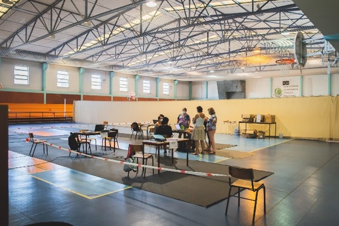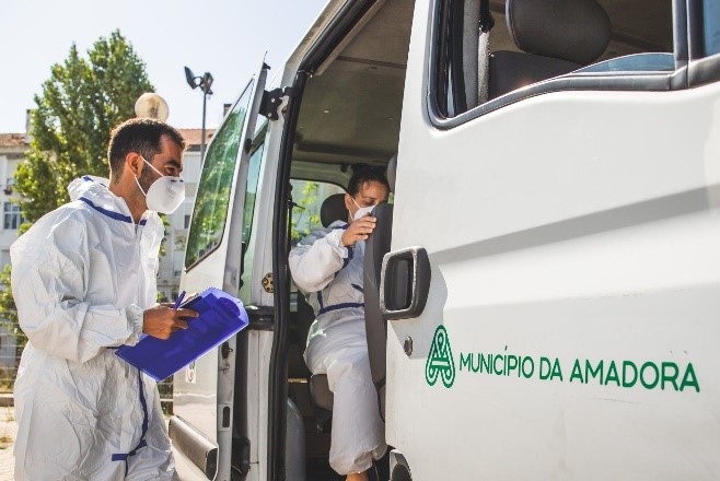 Durante o período da manhã, os elementos das EM reuniam-se no Centro de Operações Municipal Integrado (COMI), situado no Pavilhão da Escola Secundária Seomara da Costa Primo, para realizar uma reunião de programação de trabalhos onde eram discutidos e priorizados os casos sinalizados e distribuídos pelas diferentes equipas em função da geolocalização dos agregados familiares, permitindo às equipas uma rentabilização do tempo entre as deslocações (Fotografia 1). Antecedendo a saída para o terreno, os elementos das EM procediam à colocação dos EPI (Fotografia 2) e à organização dos materiais necessários à sua intervenção (Fotografia 3). Cada equipa dispunha uma viatura própria, concedida pela Câmara Municipal da Amadora, auxiliando no transporte e acesso rápido aos agregados familiares sinalizados (Fotografia 5).
