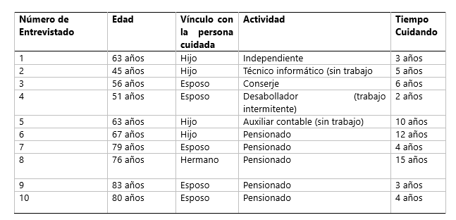 En términos muestrales, el estudio se ha basado en un diseño intencionado por criterios (Marradi, 2007). Para acceder a la muestra, se contó con el apoyo de la iniciativa gubernamental Chile Cuida en la comuna de Quinta Normal, de la Región Metropolitana. Ello, en tanto la iniciativa cuenta dentro de sus beneficiarios con: 1) cuidadores varones informales (sin remuneración), 2) receptores de cuidados sobre los 60 años en situación de dependencia. En este contexto, los criterios de inclusión muestral fueron: 1) ser el cuidador informal principal de la persona receptora de cuidados (sin remuneración) y 2) haber participado a lo menos tres meses en el programa como cuidador. Todos dieron su consentimiento informado. En este marco, la muestra final estuvo conformada por diez cuidadores, número con el cual se alcanzó saturación. La siguiente tabla presenta las características de los entrevistados: