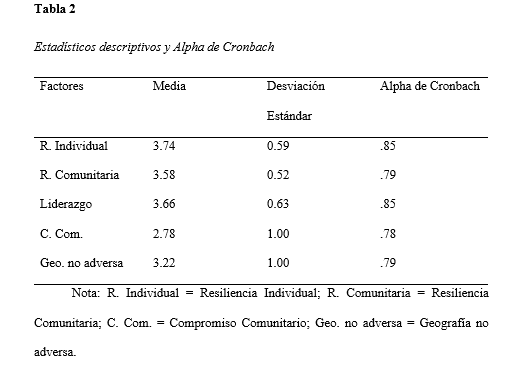 Antes de comprobar si la resiliencia comunitaria se relaciona con la resiliencia individual, se calculó la consistencia interna de los ítems que componen las variables mediante el Alpha de Cronbach y la media lineal de cada una de las variables, tanto de los factores de la resiliencia comunitaria como la media lineal total de las escalas de resiliencia individual y comunitaria. En la Tabla 2 se presentan los estadísticos descriptivos y la fiabilidad de todas las variables de estudio.