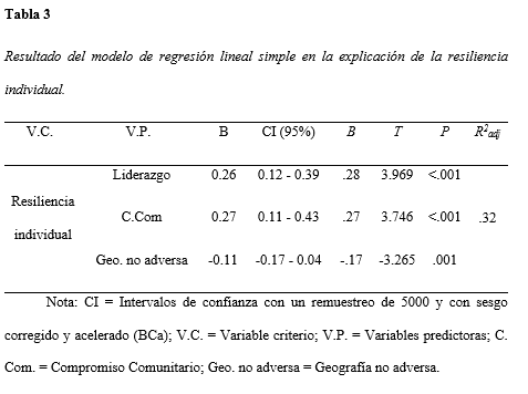 El liderazgo (. = .28; . = <.001) seguido de compromiso comunitario (. = .27; . = <.001) son los factores que mejor explican la resiliencia individual. (Ver Tabla 3).