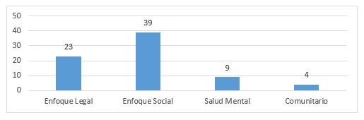 La Figura 1 revela que de manera general en las investigaciones exploradas se aprecian varios enfoques: Legal, Social, de Salud mental y Comunitario, ellos no son mutuamente excluyentes pues en un mismo objeto de investigación pueden confluir más de uno.