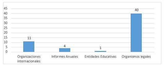 En la Figura 2 se observa que el 70% de las tesis referencian como principal fuente de datos a los Organismos legales del Estado. De igual manera, el 15% de los estudios empleó como fuente primaria, los informes de Organizaciones internacionales. El 4% utilizó los datos pertenecientes a Informes anuales del Estado y con menor incidencia, solo un 2% se refirió a documentación de Entidades educativas. Este último dato es contradictorio, si se tiene en cuenta que el fenómeno del Femicidio y las pautas generales en torno al tema han sido producto de investigaciones de varias universidades.