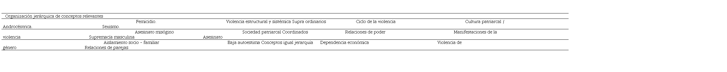En cuanto a la organización jerárquica de los conceptos utilizados en las tesis, se aprecia que, con respecto a la organización Supra ordinaria, el 87% de los estudios incluyen el concepto de Femicidio, así mismo, se ha empleado el concepto de Violencia estructural y sistemática en un 75%.