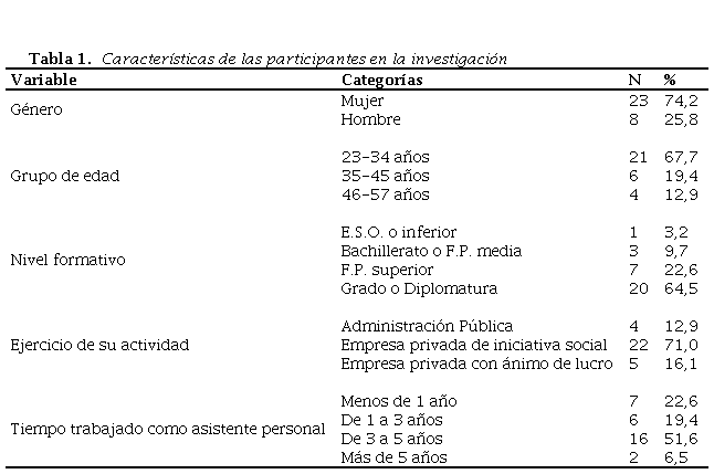 Mediante un procedimiento no probabilístico y con un muestreo estratégico, se seleccionó la población objeto de estudio atendiendo a criterios acordes con los objetivos de la investigación. Dicha elección coincide con el tipo de muestreo habitual en los estudios cualitativos (Pérez-Llantada y López, 2001) y en el presente trabajo se conformó con 31 sujetos que ejercían la asistencia personal durante la fase de recogida de la información.