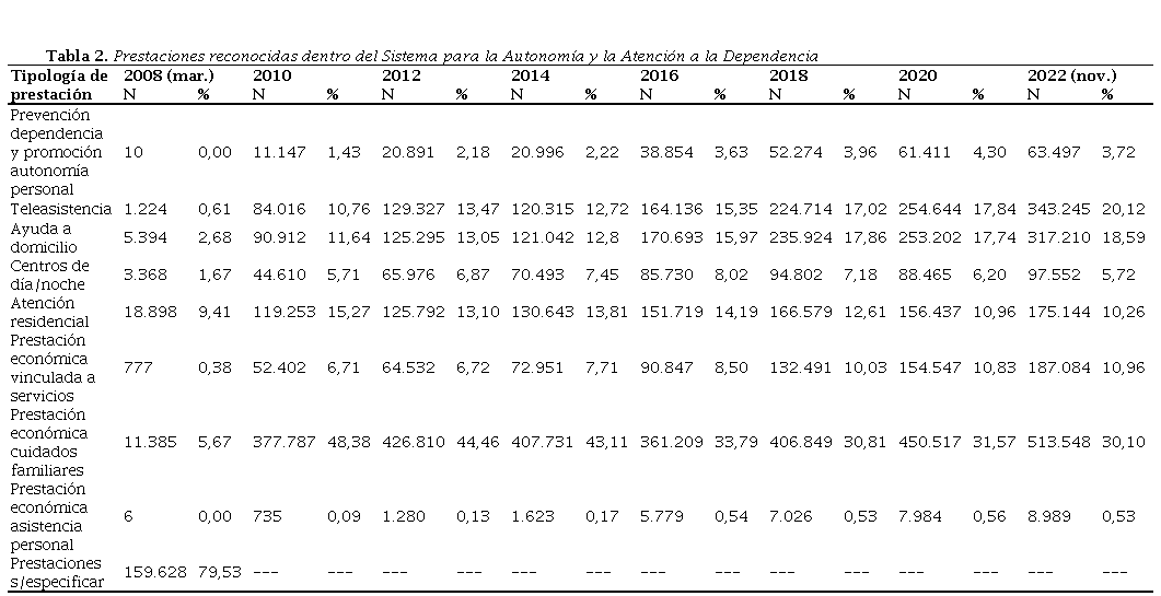 La asistencia personal es una de las prestaciones que recoge el SAAD, creado por la LEPA en 2006. Tres lustros después pueden extraerse conclusiones sobre su implantación (González-Rodríguez et al., 2019), atendiendo a su evolución bianual desde que se inició la recogida de datos estadísticos hasta la actualidad. Así se presenta la composición de lugar de las prestaciones y servicios del SAAD en la Tabla 2. Lo primero que llama la atención es lo insignificante de la asistencia personal dentro del abanico de prestaciones ofertadas. Su evolución, desde los primeros datos conocidos en el año 2008, ha sido prácticamente nula llegando actualmente, tan solo, al 0,53%. En cambio, prestaciones como la Teleasistencia o la Ayuda a domicilio han alcanzado más de un 20 y un 18% respectivamente. Otro de los servicios destinados a favorecer la vida independiente es el de prevención de las situaciones de dependencia y promoción de la autonomía personal, que sólo supera en número de resoluciones a la mencionada prestación de asistencia personal. Por otra parte, se comprueba que, en los últimos años, concretamente en el período 2014-2022, las políticas públicas de cuidados en el ámbito del SAAD apuestan especialmente por el reconocimiento de la Teleasistencia (+7,4%), la Ayuda a domicilio (+5,79%) y la Prestación económica vinculada a servicios (+3,25%) consiguiendo superar por primera vez al servicio de atención residencial. Por su parte, desde el 2016 repunta especialmente la Prestación económica de cuidados familiares (+152.339), aunque porcentualmente vea reducido su peso (-13,01%).